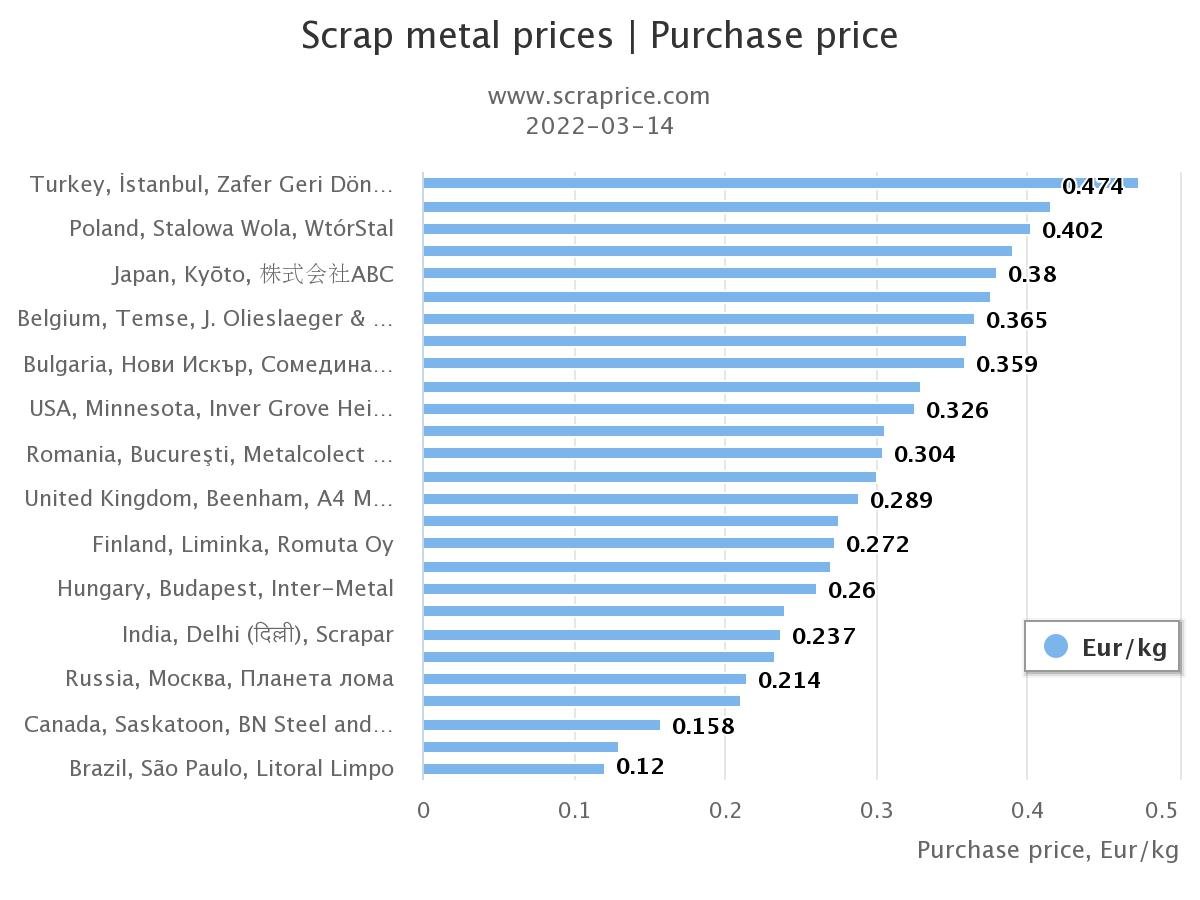Seuraava maa, jossa metalliromun hinta oli maaliskuussa 2022 erittäin korkea, on Puola. Alla olevan aikataulun mukaan metalliromun hinta oli tässä maassa noin 410 euroa tonnilta.